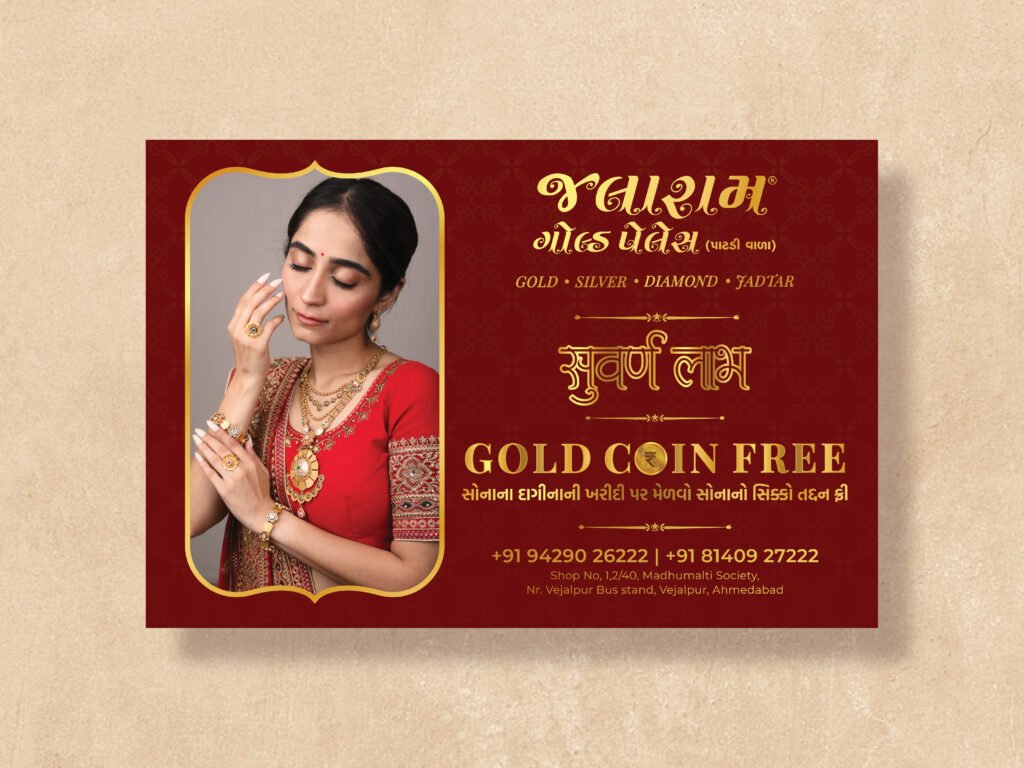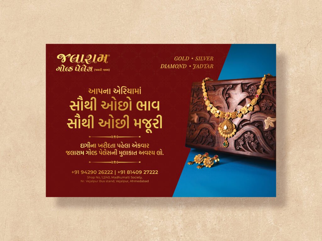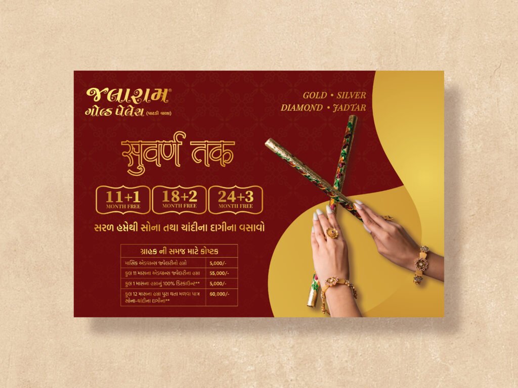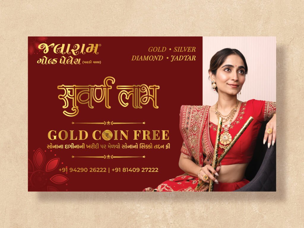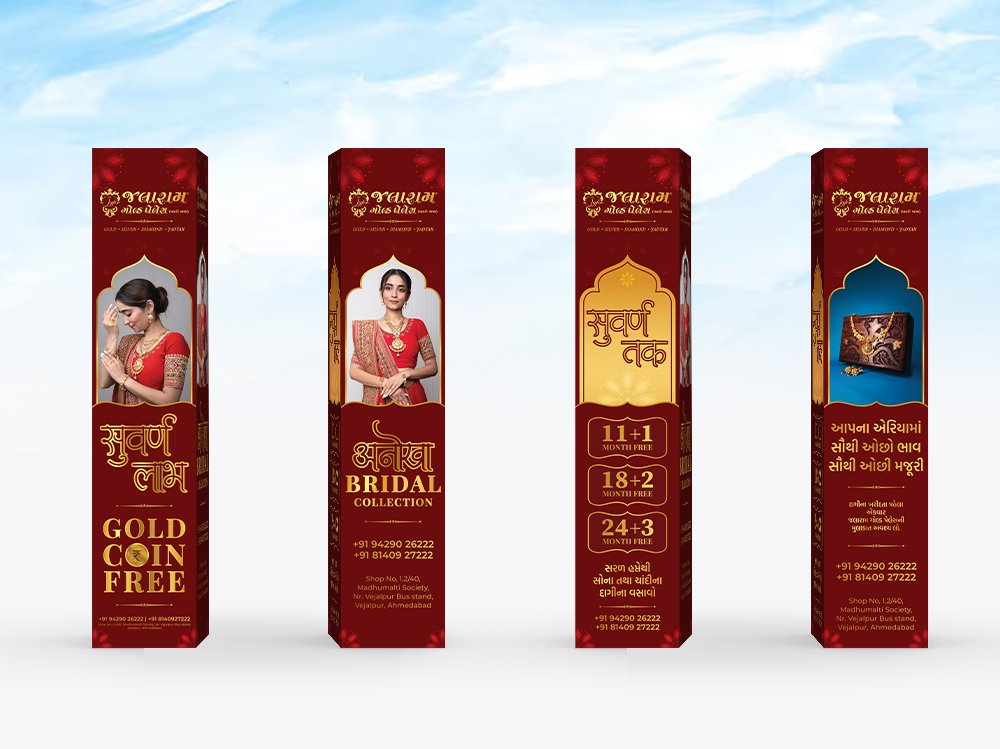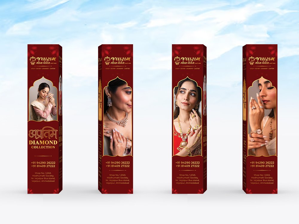 Jalaram Gold Palace partnered with us to amplify their presence during a key festive season. The goal was to design a campaign that highlighted their exquisite collection while driving in-store and online engagement. Through thoughtful visuals and strategic execution, we delivered a cohesive identity that celebrated tradition with a modern edge.